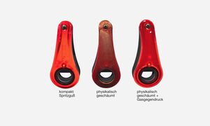 Die Musteranlage am Messestand kann einen Durchsatz von bis zu 59 kg/h Polycarbonat oder bis zu 45 kg/h Polypropylen zur Verfügung stellen. Auf ihr sollen live Flaschenöffner aus wechselnden Polymeren gefertigt werden. Deren Schussgewicht beläuft sich auf 42 Gramm. Da der Flaschenöffner noch mit einem Metalleinleger versehen wird, beträgt die Zykluszeit insgesamt 135 Sekunden.